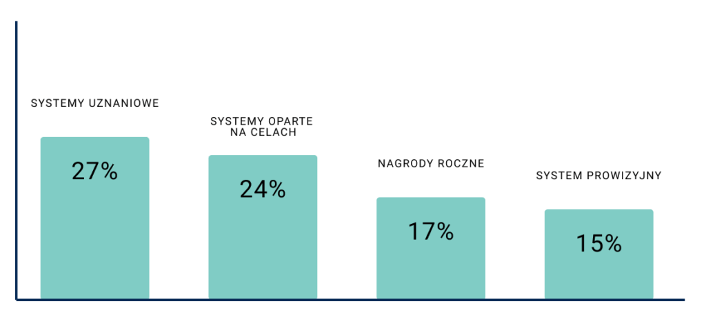 Badania z 2021 roku przeprowadzone na próbie 75 przedstawicieli firm z obszaru HR pokazało, że w 27% firm obowiązują systemy premiowe uznaniowe, w 24% system oparty na celach, a w 17% nagrody roczne. Z kolei w 15% obowiązuje system prowizyjny, a w 11% premiowany jest udział w projektach.